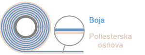 Široka paleta ribona u raznim bojama i veličinama, u zavisnosti od zelje kupca, i samog materijala na kome se štampa. Da li su to nalepnice u rolni, etikete bez lepka, ( papirne, plastične, tekstilne...), kao i u zavisnosti od otpornosti raznih uticaja ( vremenski uslovi, trenje, grebanje, smrznuti proizvodi, visoka temperatura, hemikalije, pranje.... ). Poliesterska folija, nosi pigmentsku foliju, koja ostavlja otisak na mediju uz pomoć termal transfer štampača, tačnije preko glave štampača koristeći pritisak, i elektornski zadatu temperaturu. Riboni koje proizvodi naša kompanija, imaju zaštitni sloj poliestera, koji sprečava brzo habanje termo transfer štampača, odnosno glave.